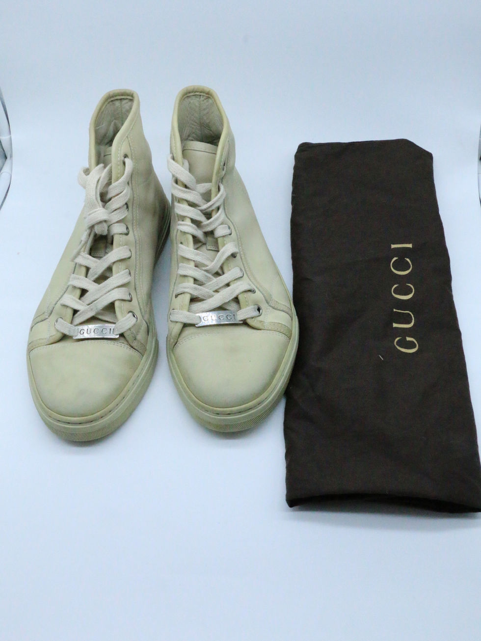 Tenis high-top Gucci de estética minimalista en un tono beige/ivory súper versátil, con líneas limpias y un look retro-cool que combina perfecto con outfits casuales y más pulidos. El detalle protagonista es la placa metálica con el logo “GUCCI” en las agujetas, que firma el par de forma discreta pero inconfundible.
