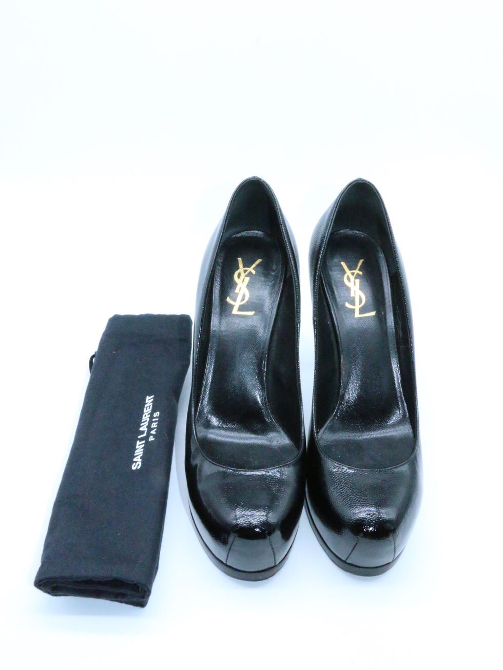 Elegantes pumps de Saint Laurent en piel negra con acabado ligeramente texturizado y brillo sutil. Su silueta clásica de punta redondeada y tacón fino estiliza la figura y los convierte en una pieza atemporal dentro del guardarropa.